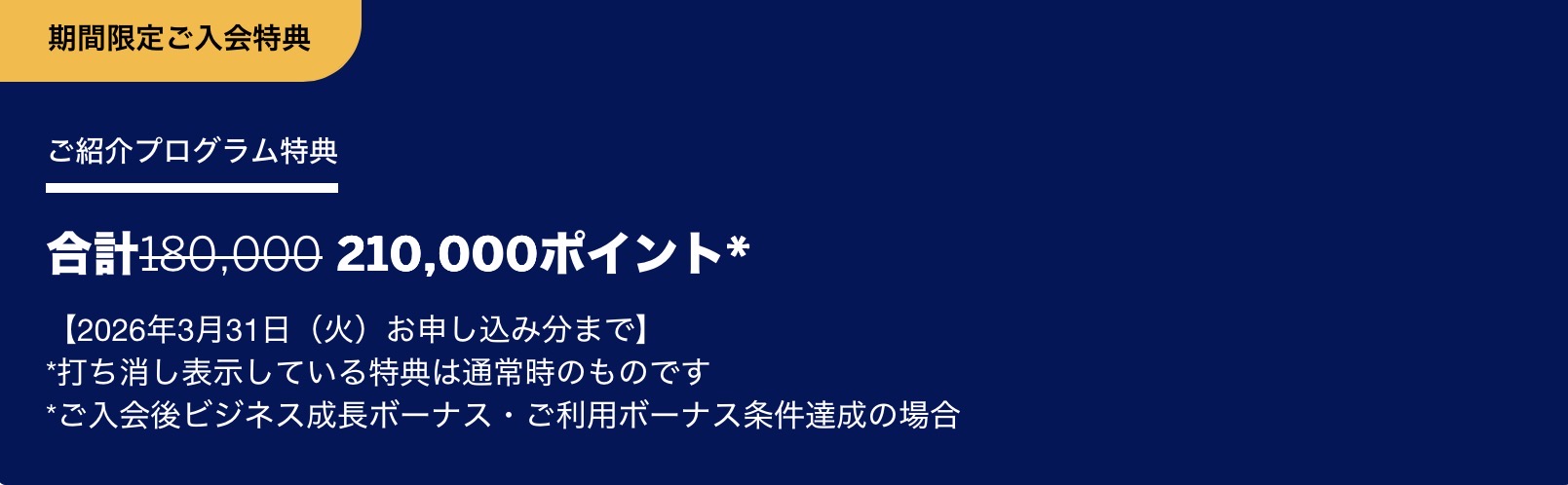 | 紹介された人特典 | 最大210,000ポイント 8ヶ月で250万円利用で達成 (3/31(火)申し込み分まで) | 最大130,000ポイント 6ヶ月で150万円利用で達成 (5/26(火)申し込み分まで) | 合計115,000Marriott Bonvoy ポイント (2025年4月14日まで) | 最大73,600ポイント (予告なく終了する場合あり) |