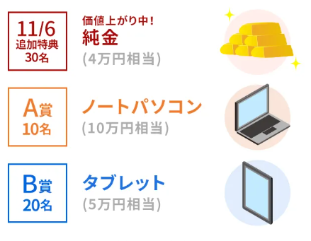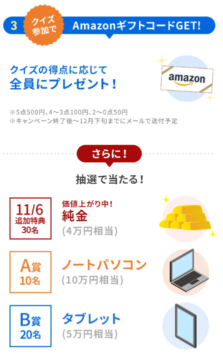 今回のキャンペーンでは、全員にAmazonギフト券と3つの豪華特典に加えて、抽選でパソコンやタブレットがあたるよ🎯
