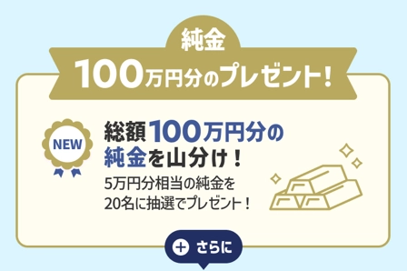 追加特典で、100万円分を山分け!抽選で20名に「5万円分相当の純金」が当たるよ✨
