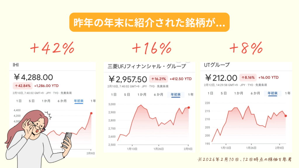 👇実際に、年末に紹介された銘柄は、たった1カ月でこんなに上昇しているよ🫣※