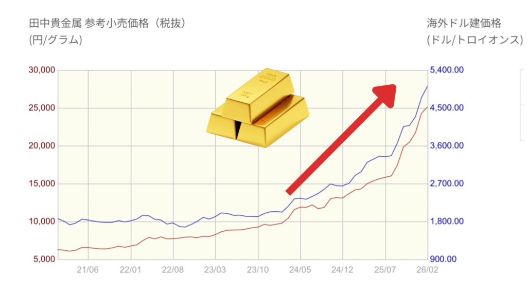 👆グラフを見て分かる通り、金は過去5年で約2〜3倍に上昇中なの📈