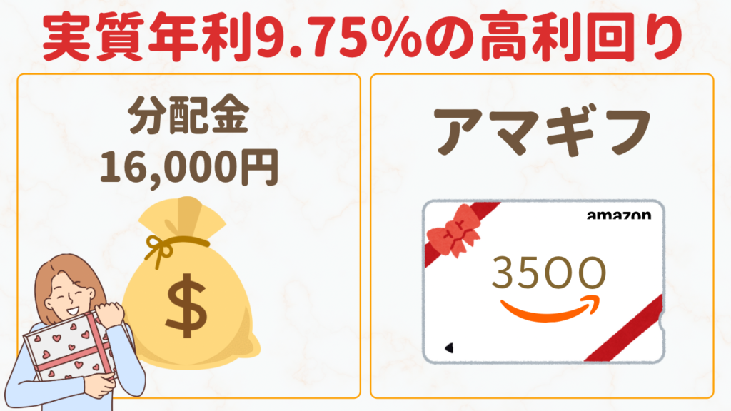 30万円投資完了した場合、配当とアマギフ合わせて16,500円分がもらえて実質年利11%になるよ🥹✨