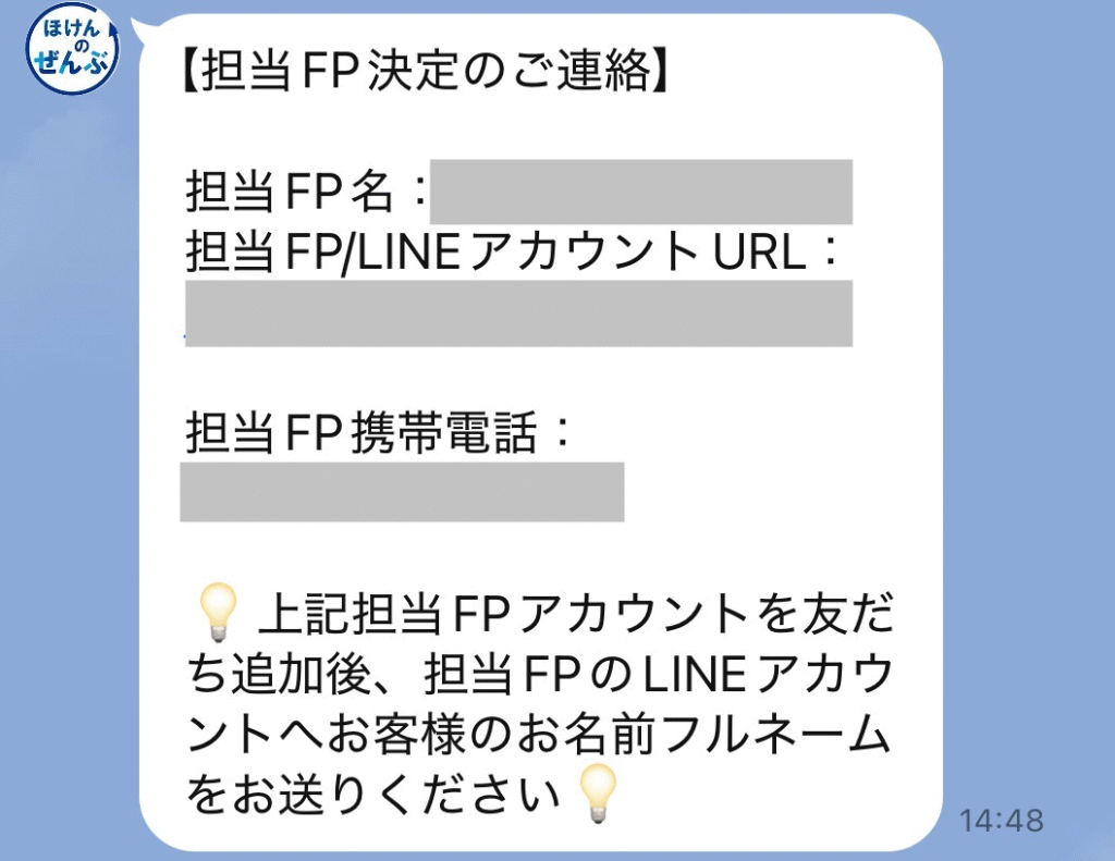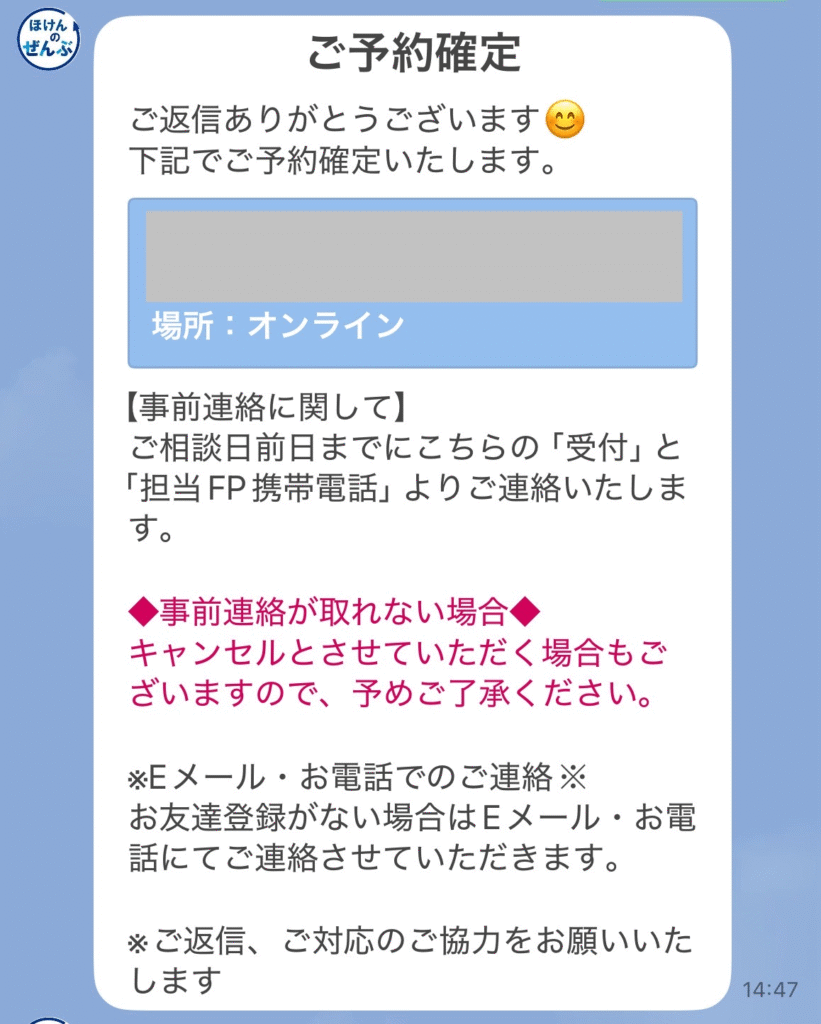 私は2時間後に、予約確定の連絡と担当FPさんの案内が届いたよ📱