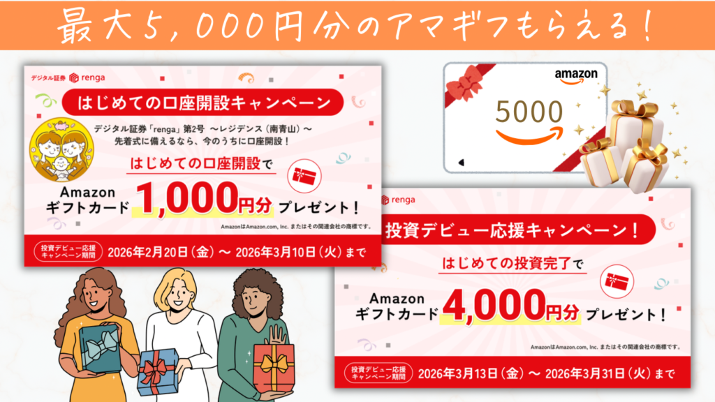 今なら3/10までに新規口座開設完了+初めての投資完了で、5,000円分のアマギフがもらえるキャンペーン開催中!