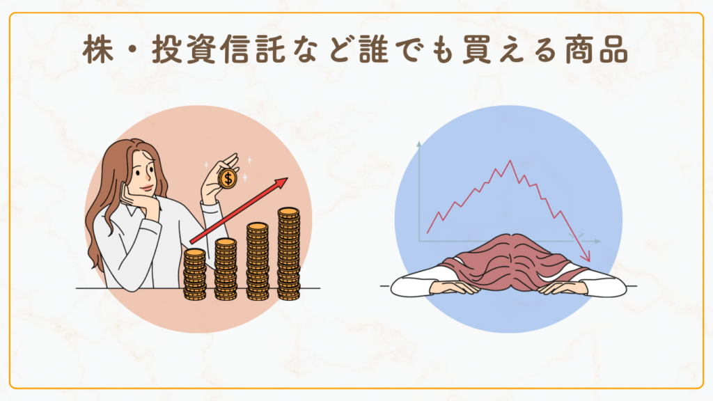 株式や投資信託がこれにあたるよ!証券口座があれば、誰でもスマホで簡単に買えちゃう商品だね✊