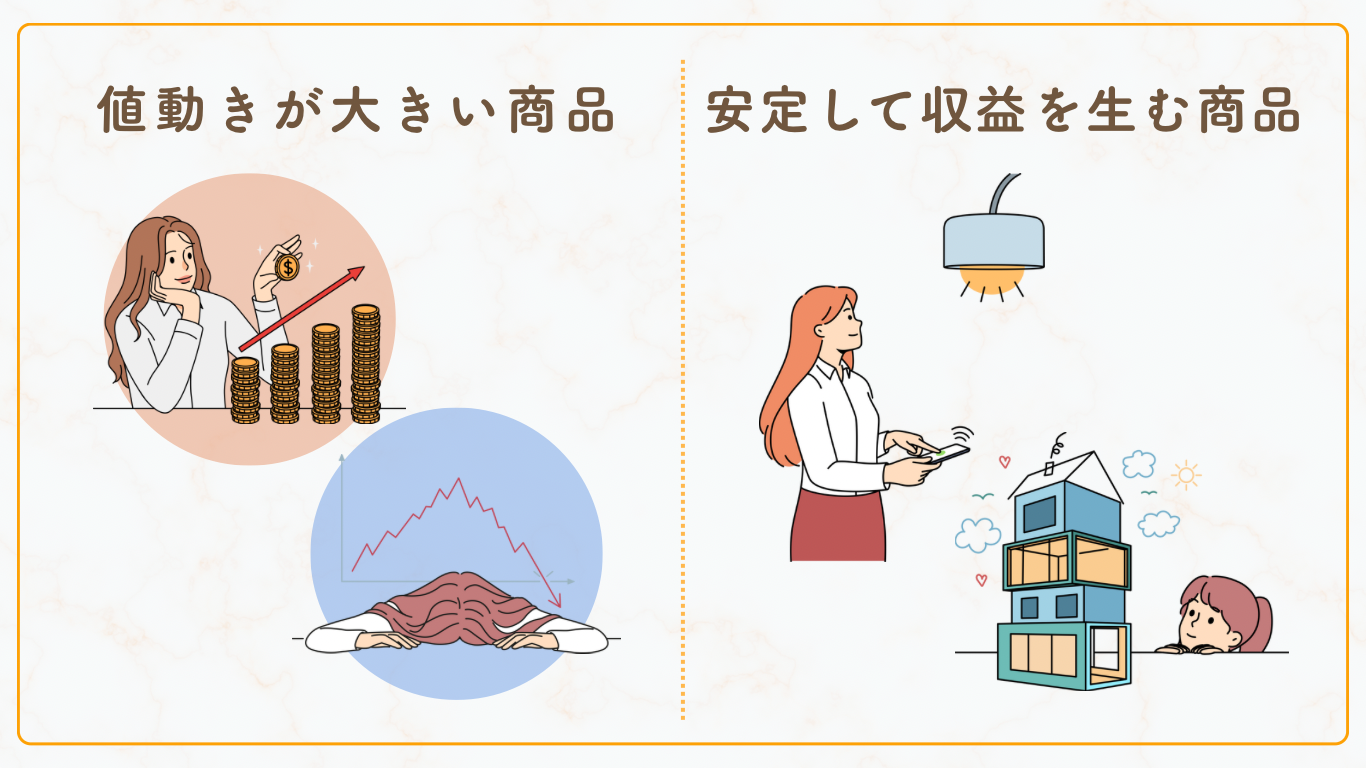 毎月の家賃収入や利用料からコツコツ収益が入るから、日々の価格変動が少なく、長期の資産づくりに向いているの!