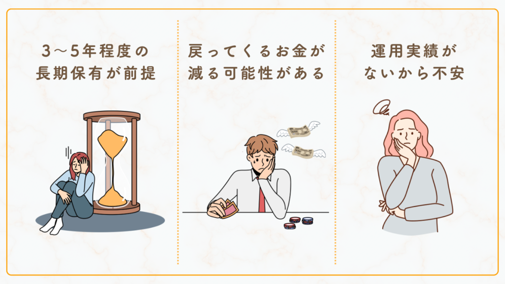 例えば、ファンド終了時に不動産を売却するんだけど、購入時より安い値段でしか売れなければ元本が一部戻ってこない可能性も🥺