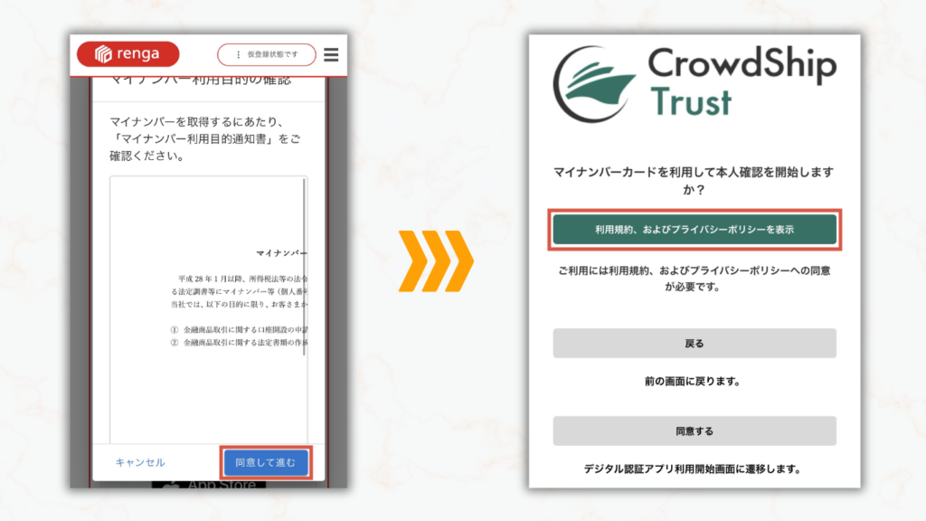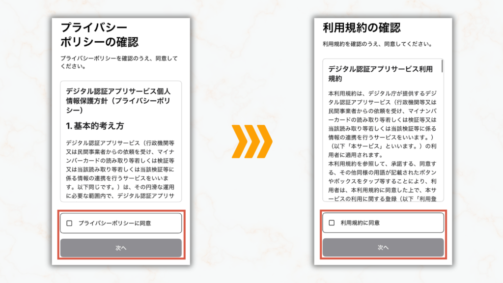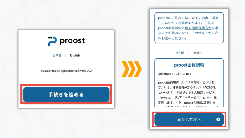 「手続きを進める」をタップして、「同意して次へ」をタップ