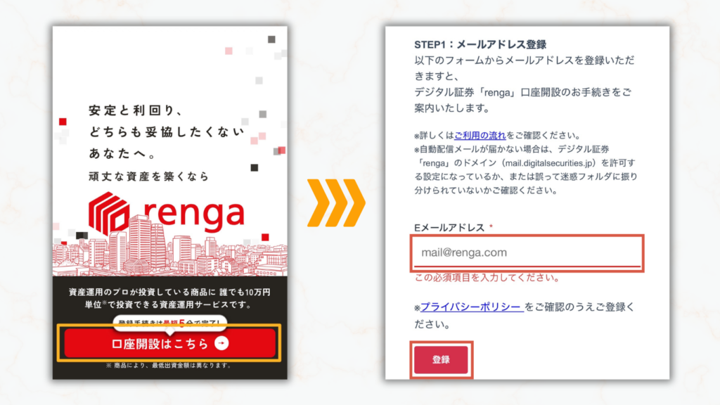 「口座開設はこちら」をタップして、メールアドレスを登録