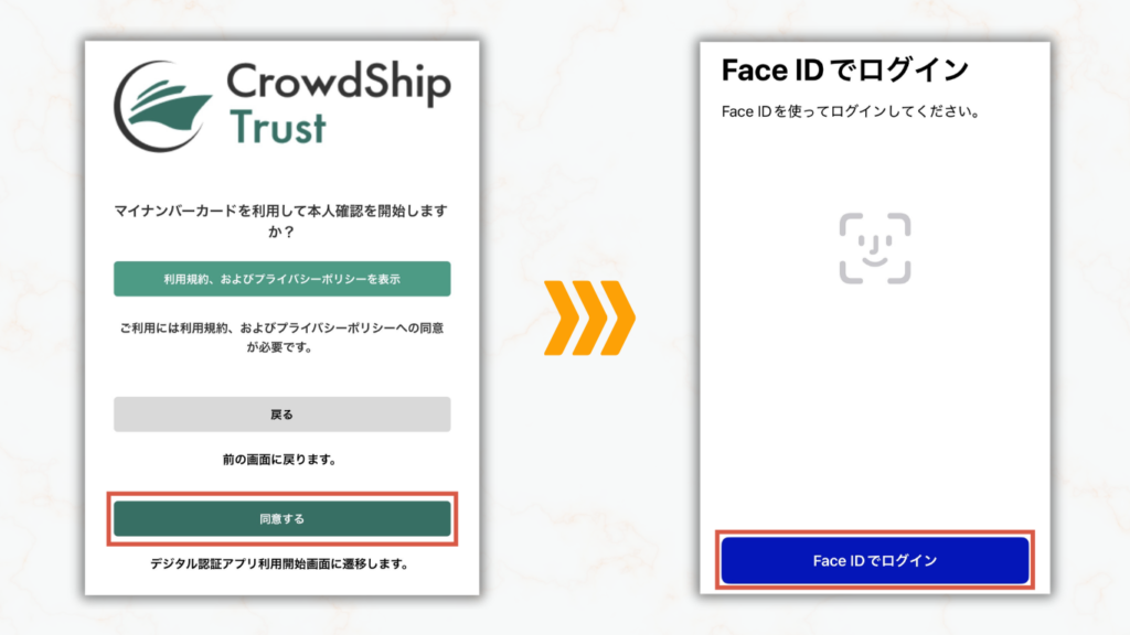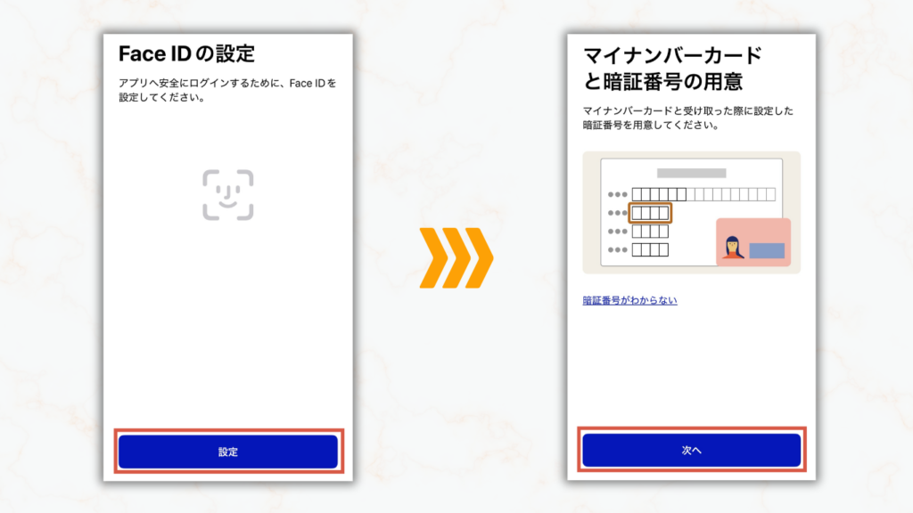 Face IDの設定をして、マイナンバーカードと暗証番号を準備し次へ