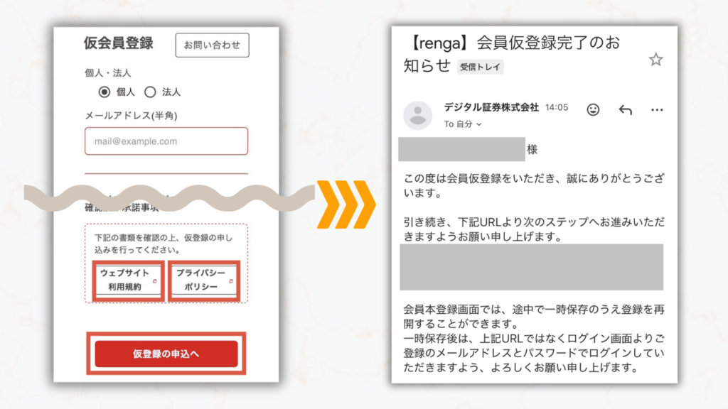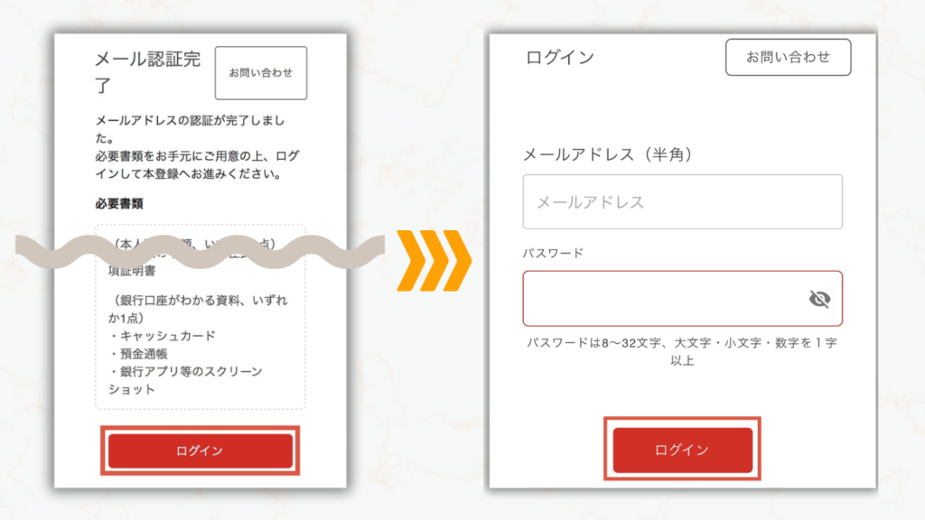 メールアドレス、ログインパスワードを設定し、2つの規約に同意